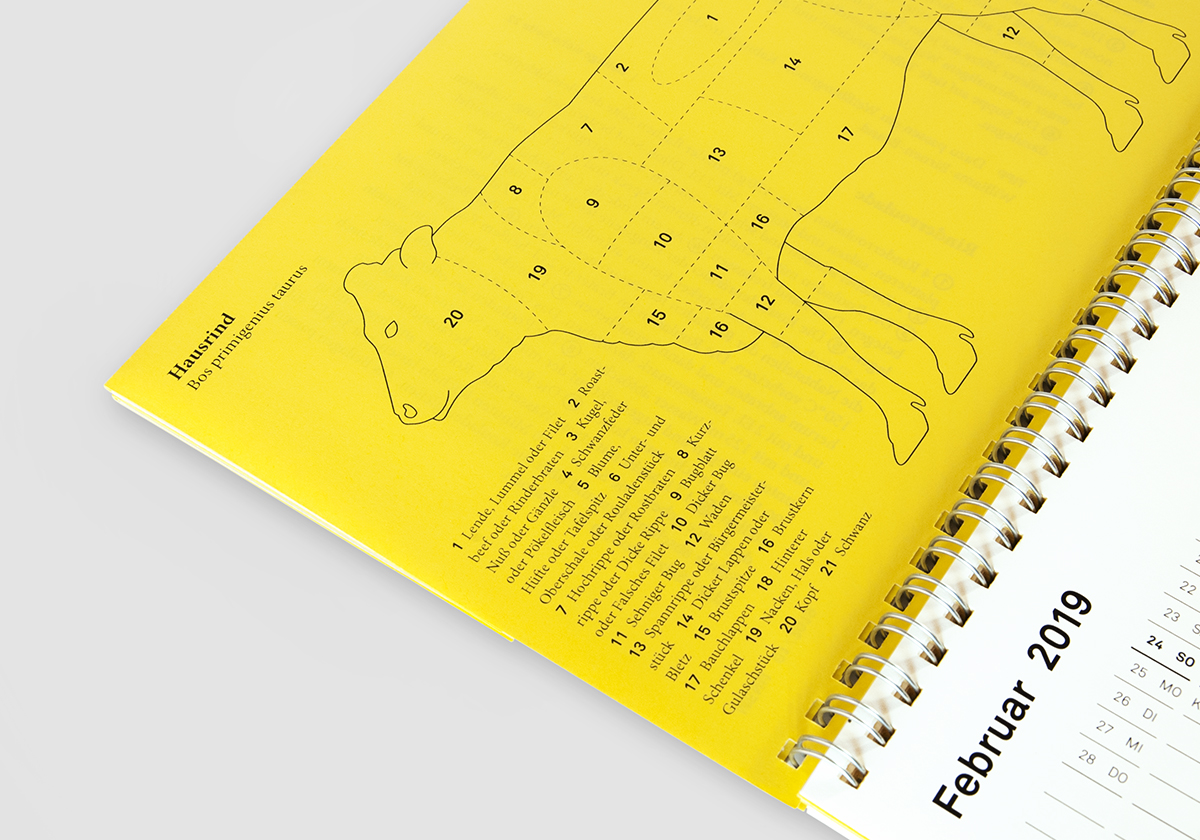 Der »Kalender 2019« ist ein Kochbuch im Taschenformat. Das Kalenderblatt eines jeden Monats wird dabei aus einer Zusammenstellung von drei kulinarischen Gerichten begleitet, die sich an den Jahreszeiten orientieren. Informationen zu Zutaten werden in Texten und Grafiken veranschaulicht. Auf diese Weise bleiben Ereignisse des Jahres als Erinnerung erhalten.