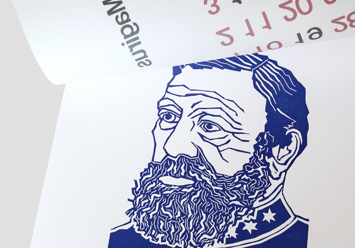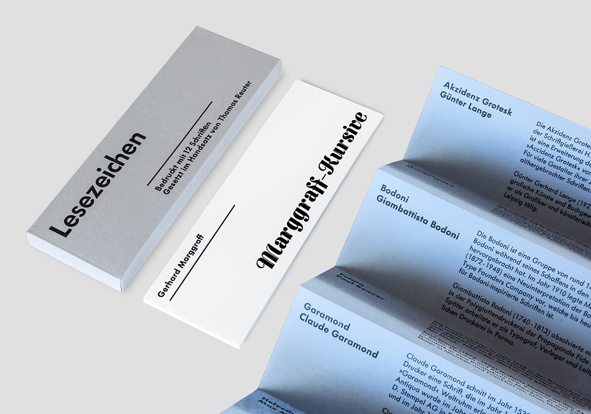 Die abgebildeten Lesezeichen wurden bedruckt mit 12 Schriften: Schadow, Neon, Memphis, Helvetica, Futura, Lichte Grotesk, Akzidenz Grotesk, Garamond, Ariston, Bodoni, Marggraff-Kursive und Palatino. Ein beiliegendes Faltblatt informiert über die Geschichte dieser Schriften und ihre Gestalter. Alle Texte wurden im Handsatz gesetzt und an einem Original Heidelberger Zylinder gedruckt.