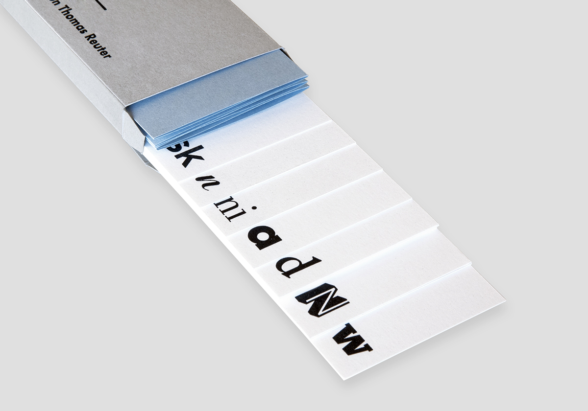 Die abgebildeten Lesezeichen wurden bedruckt mit 12 Schriften: Schadow, Neon, Memphis, Helvetica, Futura, Lichte Grotesk, Akzidenz Grotesk, Garamond, Ariston, Bodoni, Marggraff-Kursive und Palatino. Ein beiliegendes Faltblatt informiert über die Geschichte dieser Schriften und ihre Gestalter. Alle Texte wurden im Handsatz gesetzt und an einem Original Heidelberger Zylinder gedruckt.